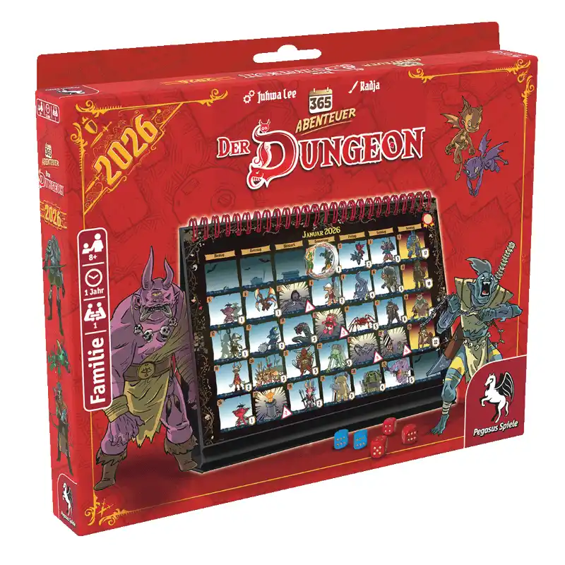 Mit 356 Adventures – The Dungeon schlüpfen die Spielenden für ein ganzes Jahr lang in die Rolle der tapferen Heldin Mira und begeben sich auf ein spannendes Abenteuer durch einen gefährlichen Dungeon. Jeden Tag rücken sie auf dem Jahreskalender tiefer in den Dungeon vor. Um die endlose Schar an Monstern zu besiegen und möglichst viele Punkte zu erzielen, müssen sie täglich eine Würfelprobe bestehen. Mit jedem neuen Monat geht auch das Abenteuer weiter und eine neue Regel, z.B. mit neuen Herausforderungen, verbesserter Ausrüstung oder magischen Gegenständen, kommt dazu.